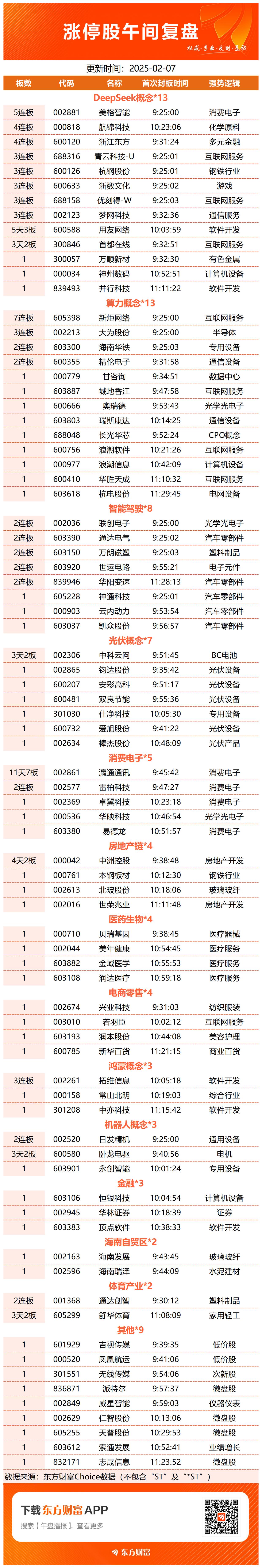 板块方面,DeepSeek、算力方向再度大涨,首都在线等多股涨停,美格智能5连板。光伏概念股展开反弹,钧达股份等涨停。大金融股震荡走强,华林证券涨停。比亚迪智驾概念股维持强势,联创电子等涨停。